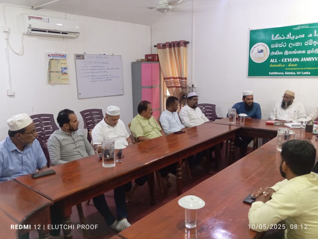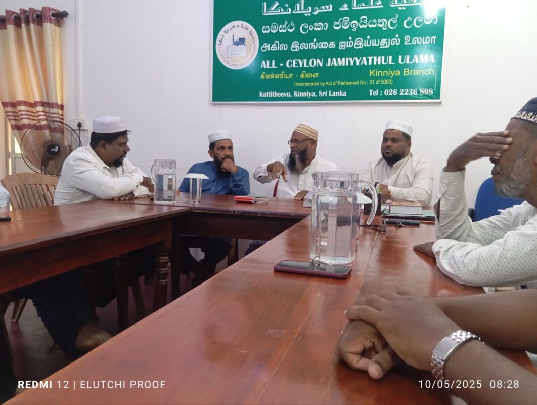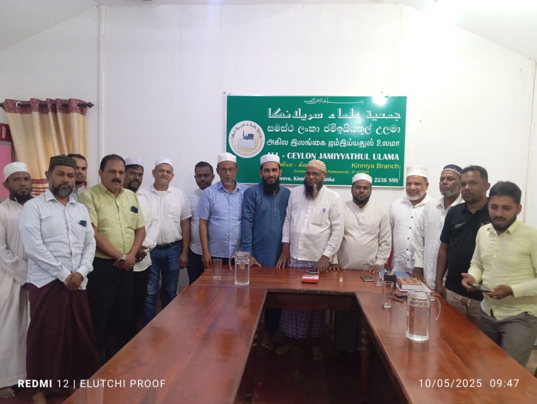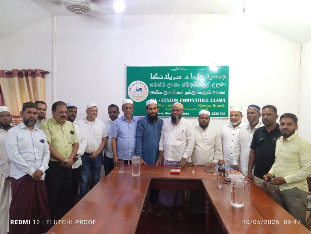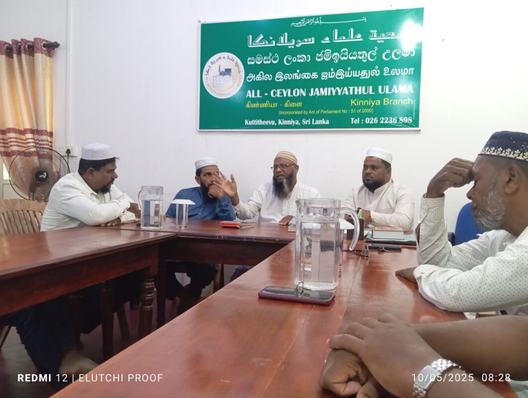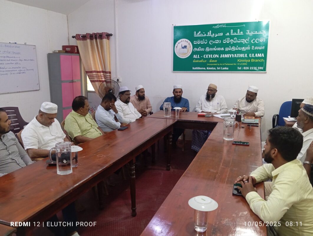 நேற்றைய கள விஜயத்தின் பின்னர் 2025.10. 05 சனிக்கிழமை இன்று காலை ஐக்கிய சமாதான கூட்டமைப்பின் தவிசாளர் உட்பட்ட குளாம் மற்றும் கொழும்பு மாநகர சபை உப தவிசாளர், உறுப்பினர்கள் சகிதம் திருகோணாமலை மாவட்ட, முத்துநகர் விவசாயிகளின் விவசாயக் காணி அபகரிப்பு/ வெளிநாட்டு தொழிற்சாலைகளுக்கு கொடுத்தமை தொடர்பாகவும், அதற்கு மாற்றீடாக அம்மக்களின் பூர்வீக பிரதான வீதியில் பள்ளிவாயிலை அண்மித்து அமைந்திருக்கும் காணியை வழங்குவது சம்பந்தமாகவும், கிழக்கு மாகாண அனைத்து பள்ளி வாயில்கள் சம்மேளனம், அனைத்து மாவட்ட உலமா சபைகள், சங்கங்களின் தலைவர்கள் அனைவரையும் ஒன்றிணைத்து கையெழுத்து வேட்டை ஒன்றை ஆரம்பித்து அதனூடாக அரசாங்கத்திற்கு இப்பிரச்சினை சம்பந்தமாக தெளிவுபடுத்தி பாதிக்கப்பட்ட மக்களுக்கான தீர்வை வெகு விரைவில் பெற்றுக் கொடுப்பதற்கு அதிரடி தீர்மானங்கள் கிண்ணியா ஜம்மியத்துல் உலமா சபையுடன் மேற்கொள்ளப்பட்டுள்ளது.