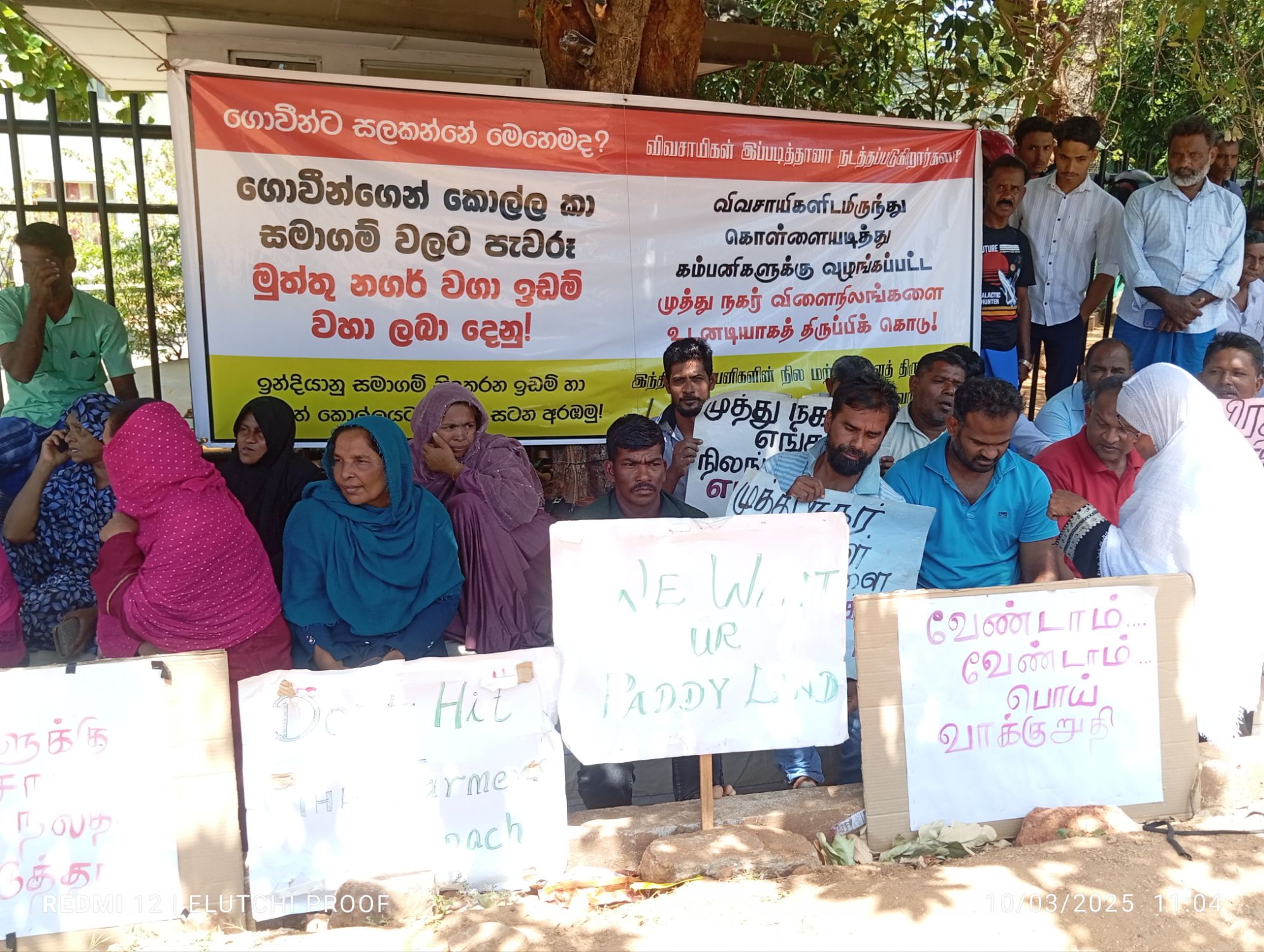 திருகோணாமலை மாவட்டம், முத்துநகர் விவசாயிகளின் விவசாயக் காணிகள் அபகரிக்கப்பட்டு, அவர்கள் அதற்காக அரசாங்கத்திடம் நீதி கேட்டு போராட்டங்களை ஆரம்பித்து இன்றுடன் பல மாதங்கள் கடந்தும் பிரதமர் கௌரவ ஹரினி அமர சூரிய அவர்கள் அந்த விவசாயிகளுக்கு குறித்த திகதிக்குள் தீர்வினை பெற்றுத் தருவதாக கூறி பல மாதங்கள் கடந்த நிலையிலும் அம்மக்கள் பட்டு மலையிலும் , வெயிலிலும் சொல் அண்ணா துயரங்களை அனுபவித்துக் கொண்டு நீதி கிடைக்கும் என அங்கலாய்த்தவர்களாக காத்துக் கிடக்கின்றனர்.