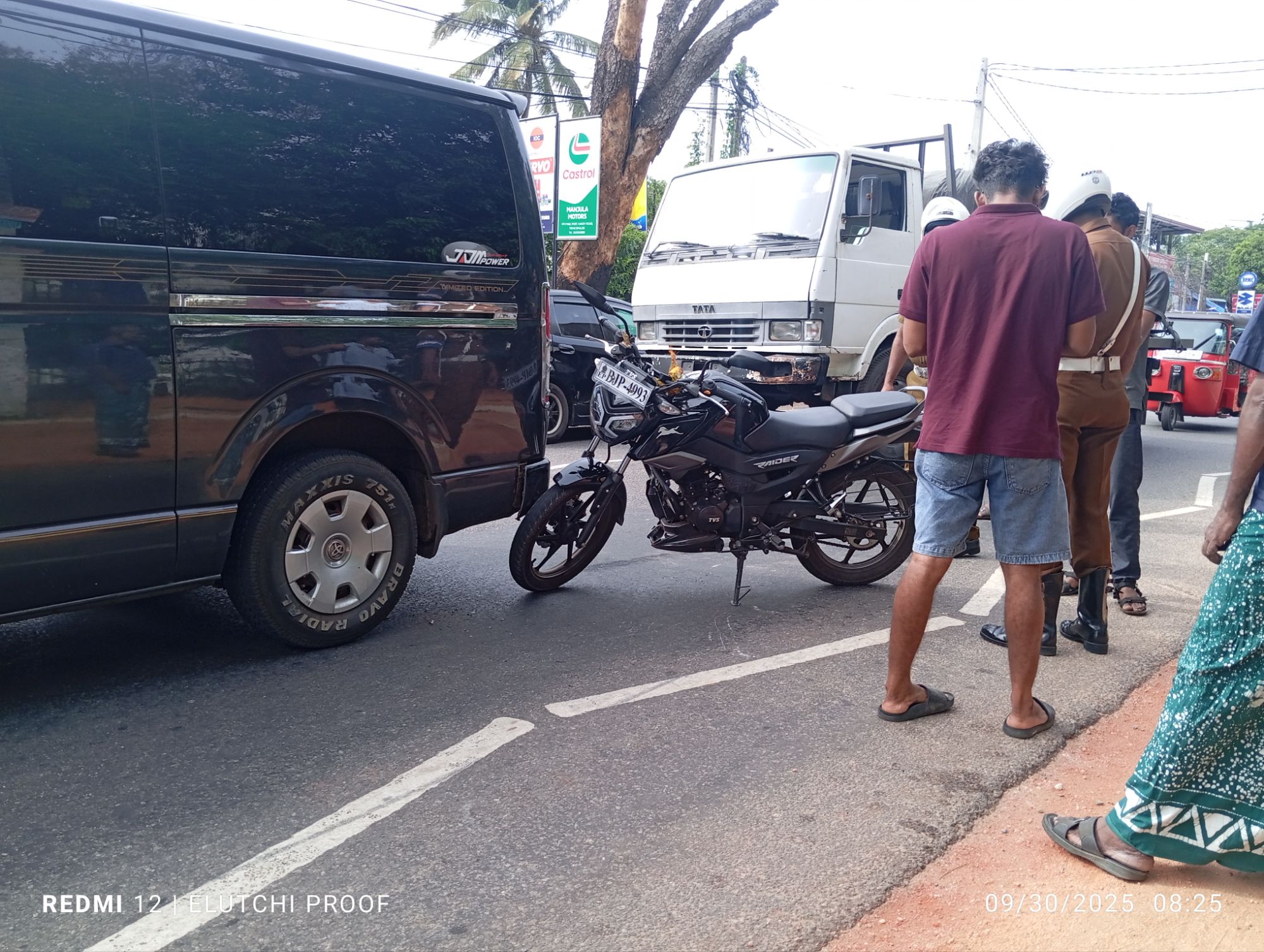 30.09.2025 தற்போது திருகோணாமலை மாவட்டம் செயலகத்திற்கு முன்னால் பாதசாரி கடவையில் பெண் ஒருவர் கடந்து சென்றதைக் கண்டு சொகுசு வேன் திடீரென நிறுத்தியதில் சொகுசு வேனுக்கு பின்னால் வந்த மோட்டார் சைக்கிள் கட்டுப்பாட்டை இழந்து சொகுசு வேனின் மீது மோதி உள்ளது. இதனால் மோட்டார் சைக்கிளில் வந்த நபர்களுக்கு சிறிய அளவு காயங்கள் ஏற்பட்டுள்ளது.
