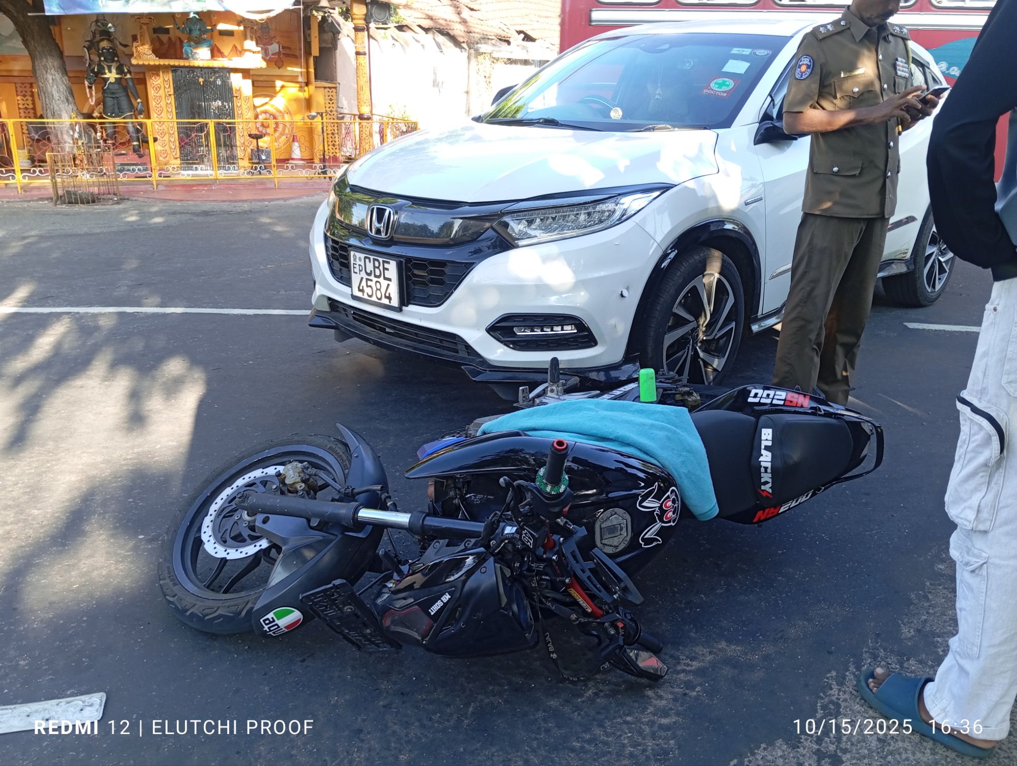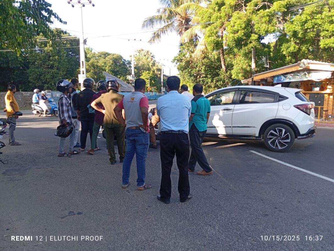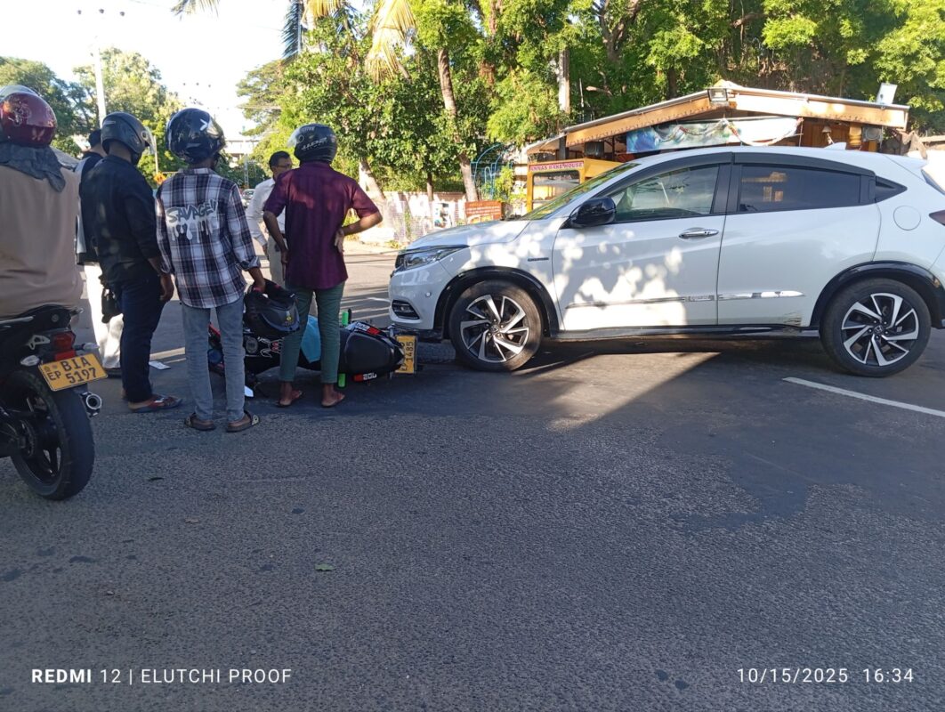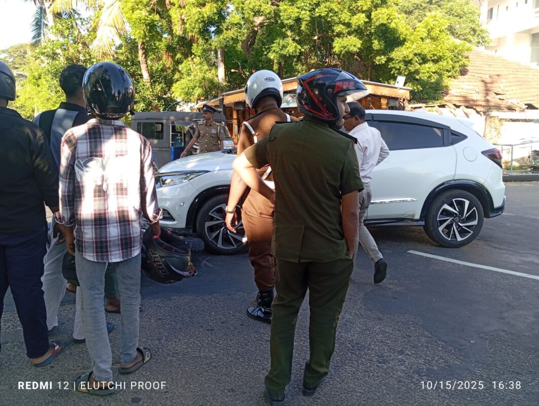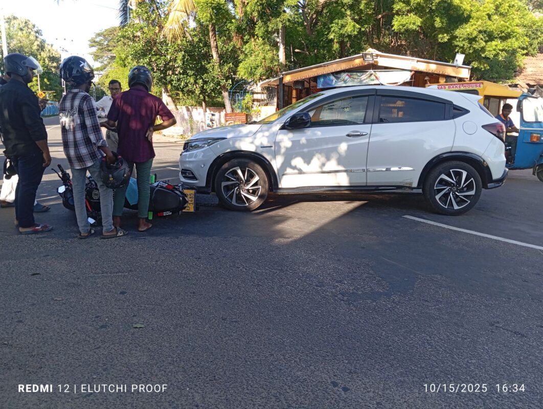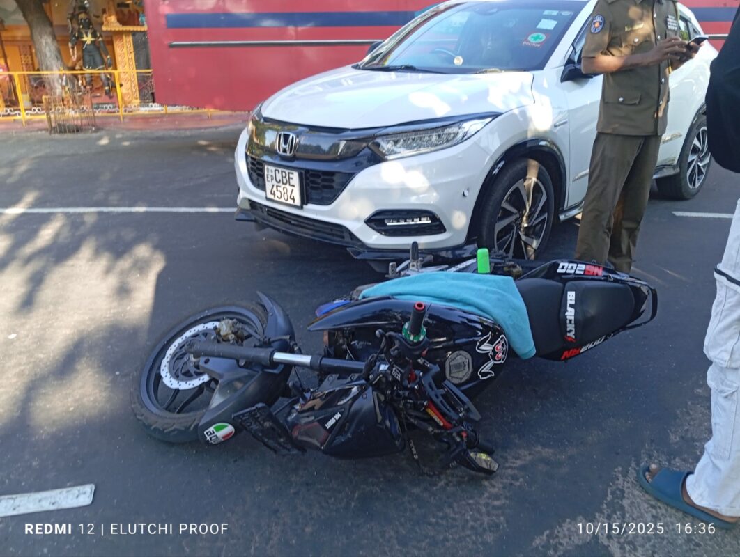 2025.10.15 தற்போது திருகோணாமலை மாவட்ட நீதிமன்றத்திற்கு முன்னால் உள்ள நாற்ச் சந்தியில் கார் ஒன்றும் மோட்டார் சைக்கிள் ஒன்றும் மோதியது ; மேலதிக விசாரணைகளை போலீசார் மேற்கொண்டு வருகின்றனர்.