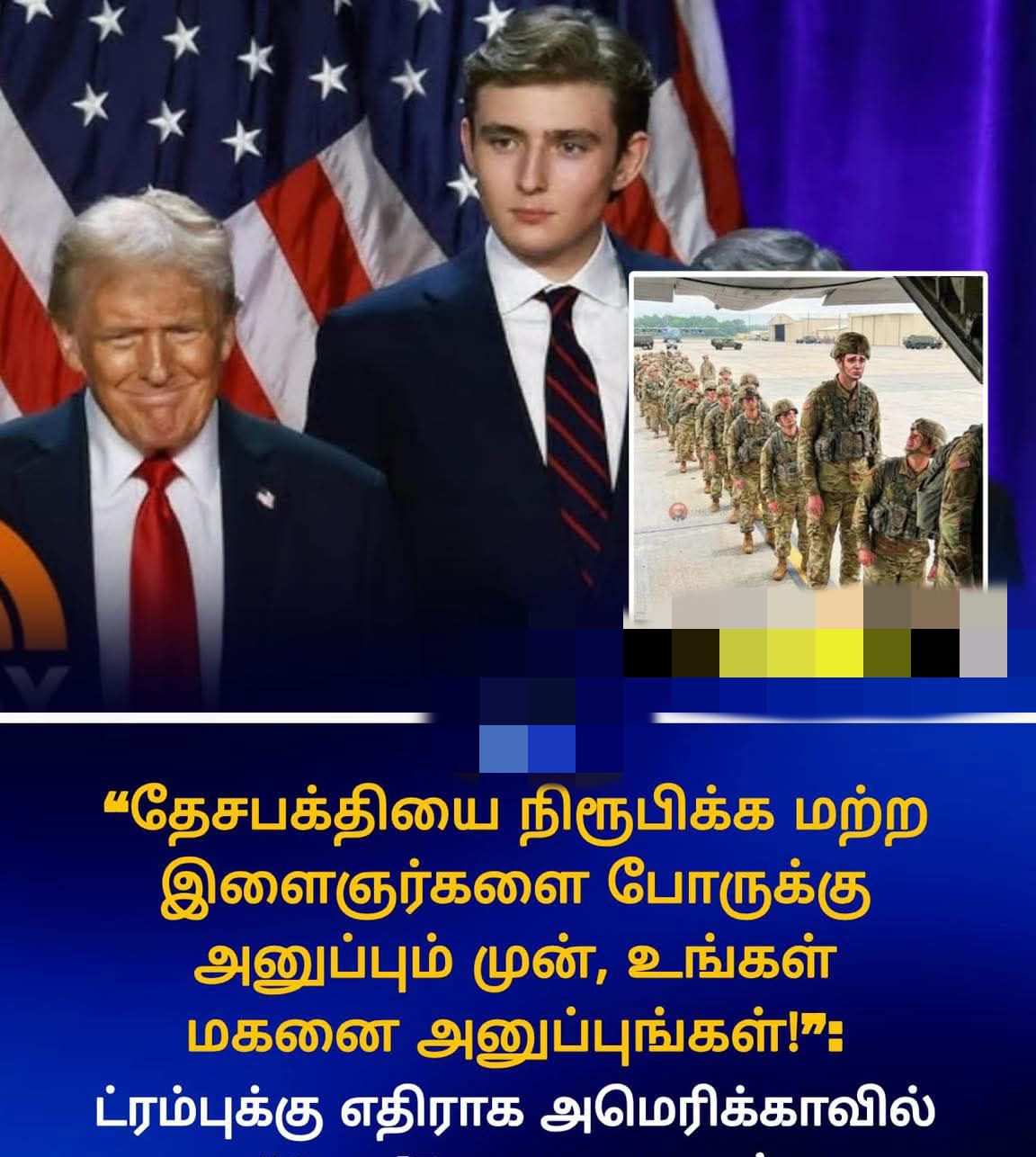 சமூக வலைதளங்களில் #SendBarron என்ற ஹேஷ்டேக் வைரலாகி வருவதுடன், ட்ரம்பின் 19 வயது மகன் பரோன் ட்ரம்ப்பை (Barron Trump) உடனடியாக ராணுவத்தில் சேர்த்து ஈரான் போருக்கு அனுப்ப வேண்டும் என்று ஆயிரக்கணக்கான அமெரிக்கர்கள் கோரிக்கை விடுத்து வருகின்றனர். “மற்ற இளைஞர்களைப் போருக்கு அனுப்பும் அதிபர், முதலில் தனது சொந்த மகனை அனுப்பி தனது தேசபக்தியை நிரூபிக்க வேண்டும்” என்று மக்கள் ஆவேசமாகப் பதிவிட்டு வருகின்றனர்.