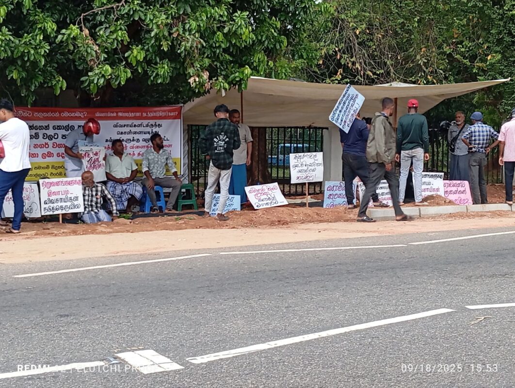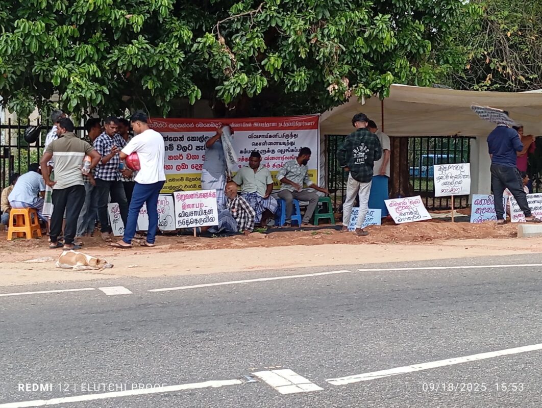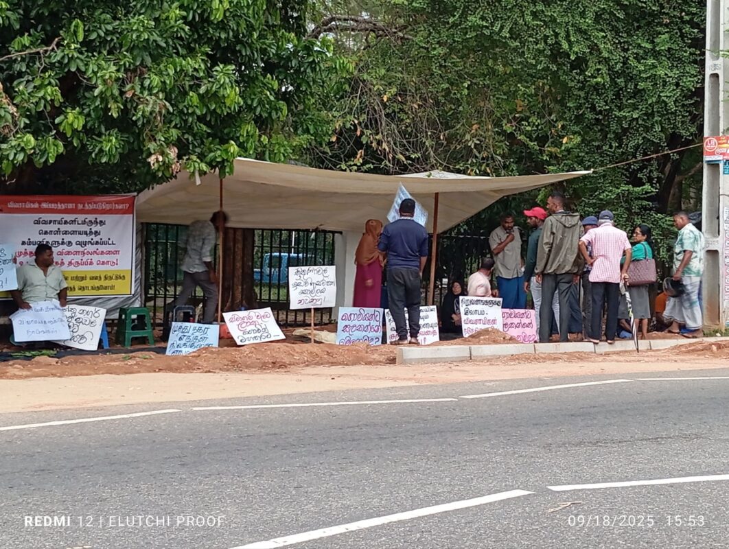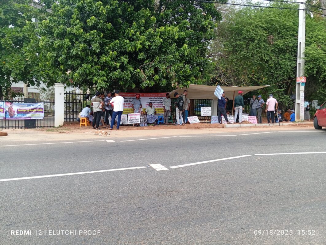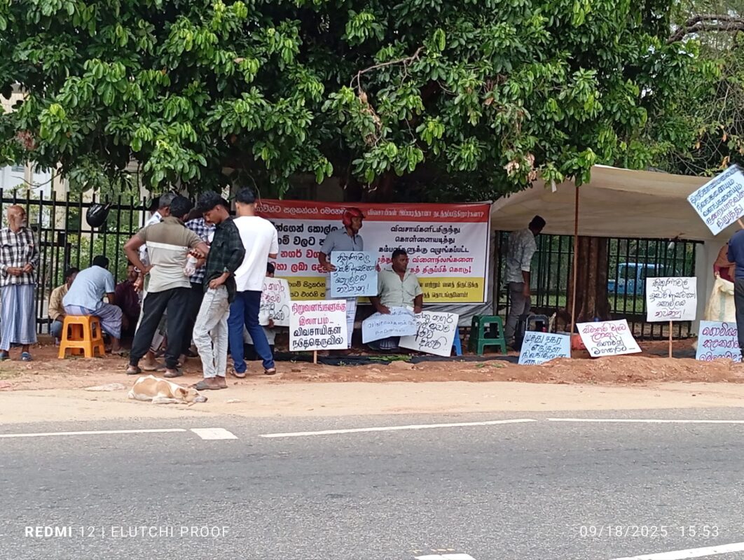 18.09.2025 இன்று காலை திருகோணமலை மாவட்ட செயலக , அரசாங்க அதிபர் காரியாலயத்திற்கு முன்னால் திருகோணமலை மாவட்ட, முத்துநகர் மக்கள் தங்களுடைய விவசாய நிலங்களை அரசாங்கம் இந்திய நிறுவனங்களுக்கு விற்பனை செய்வதை நிறுத்தி தங்கள் நிலங்களை தம்மிடமே ஒப்படைக்குமாறும் கோரிக்கை முன்வைத்து காலையிலிருந்து தற்போது வரை (மாலை) ஆர்ப்பாட்டத்தில் ஈடுபட்டுள்ளனர்.