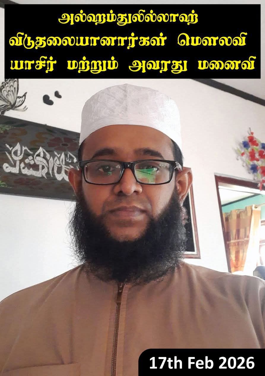 2021 ஆம் ஆண்டு டிசம்பர் மாதம் ராமநாதபுரம் பகுதியில் யாஸீர் மௌலவியும், அவருடைய மனைவியும் போலியான இந்திய கடவு சீட்டு மற்றும் தொலைபேசி அட்டைகள் என்றெல்லாம் பல போலியான குற்றச்சாட்டுகளுடன் கைது செய்யப்பட்டிருந்த தம்பதியினர் 2026.02.17 நேற்றைய தினம் ராமநாதபுர நீதிமன்றத்தினால் குற்றமற்றவர்கள், நிரபராதிகள் என தீர்ப்பளிக்கப்பட்டு விடுதலை செய்யப்பட்டார்கள்; இன்ஷாஹ் அல்லாஹ் வெகு விரைவில் அவர்கள் சென்னையில் அமைந்துள்ள இலங்கை தூதரகத்தின் ஊடாக நாட்டிற்கு அனுப்பி வைக்கப்படுவார்கள்.