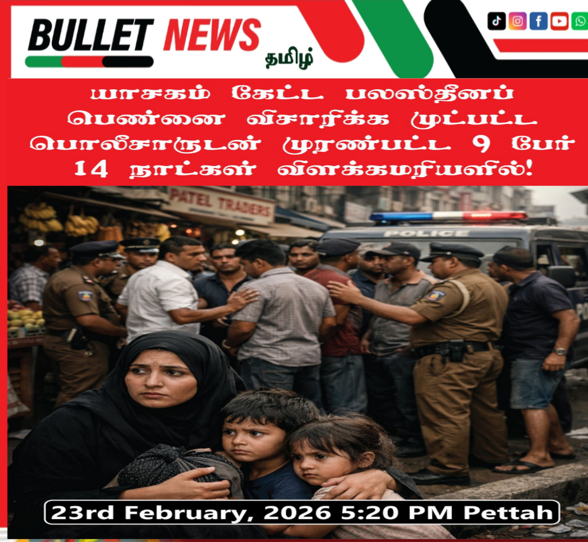 23.02.2026 நேற்றைய தினம் கொழும்பு புறக்கோட்டை பகுதியில் பலஸ்தீனத்தைச் சேர்ந்த ஒரு தாயும் இரண்டு குழந்தைகளும் இரண்டாம் குறுக்குத் தெருவில் யாசகம் கேட்டுக் கொண்டிருக்கின்ற போது கொழும்பு புறக்கோட்டை போலிசார் வாகனத்தில் வந்து உங்களை விசாரிக்க வேண்டும் வாருங்கள் என்று பலாத்காரம் பண்ணிய போது அங்கிருந்த மக்கள் போலீசாரிடம் அவர்களை கூட்டிச் செல்ல வேண்டாம் என வாக்குவாத பட்டுள்ளனர்; அதனை அடுத்து அந்தப் பெண்ணும் இரு குழந்தைகளும் அங்கிருந்து வெளியேறியுள்ளனர்; போலீசார் மீண்டும் அங்கிருந்த மக்களை தங்களுடைய கடமைக்கு இடையூறு விளைவித்ததாக கூறி சுமார் 30 நபர்களை அராஜகமாக, தீய மற்றும் கொடூரமான வார்த்தைகளால் திட்டி அநியாயமான முறையில் கைது செய்து புறக்கோட்டை போலீசிற்கு கொண்டு சென்று சுமார் இரண்டு மணித்தியாலங்களுக்கு பிற்பாடு 23 நபர்களை பொலிசிலிருந்து வீட்டுக்கு அனுப்பிவைத்துவிட்டு மேலும் இரு நபர்களை சந்தேகத்தின் பெயரில் கைது செய்தனர்; ஏனைய 09 நபர்களையும் இன்று கொழும்பு நீதிமன்றத்திற்கு ஆஜர் படுத்திய பிற்பாடு நான்கு நபர்களுக்கு எதிர்வரும் ஐந்தாம் திகதி வரையிலும் , மீதி 5 பேரை எதிர்வரும் 11ம் தேதி வரையிலும் விளக்கம் மறியலில் வைக்குமாறு கொழும்பு நீதிமன்ற நீதவான் உத்தரவிட்டுள்ளார்.